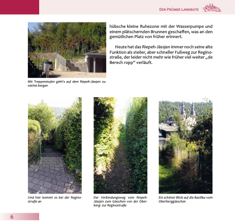 Heute hat das Riepeh-Jässjen immer noch seine alte Funktion als steiler, aber schneller Fußweg zur Regino- straße, der leider nicht mehr wie früher viel weiter „de Berech ropp“ verläuft.